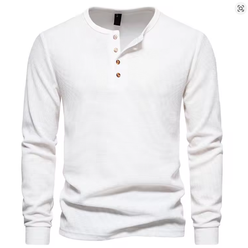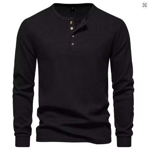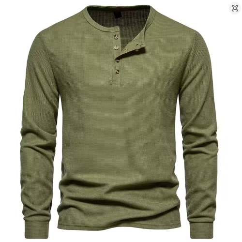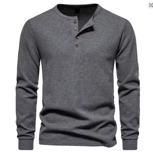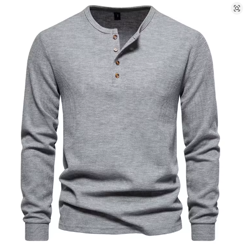- Regarder:Une texture classique en maille gaufrée et un simple col à boutons Henley.